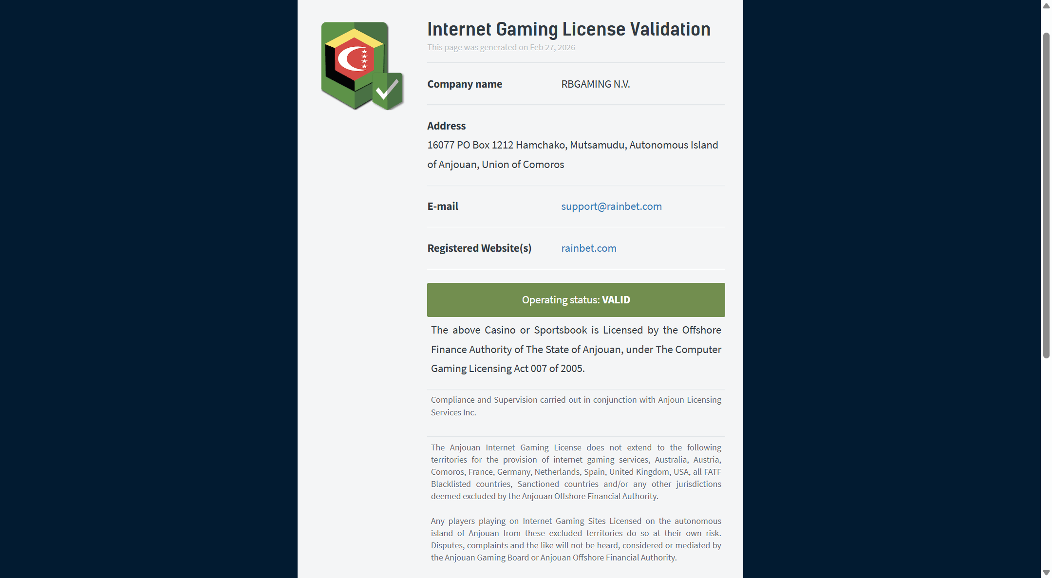 Rainbet is operated by RBGAMING N.V. and holds offshore gambling licences, including Curaçao and Anjouan jurisdictions. For a crypto‑leaning platform that mixes sports betting, slots, and in‑house games, Curaçao and Anjouan have become the default combo: enough to operate globally, not enough to give you the heavyweight player protection of MGA or UKGC sites.