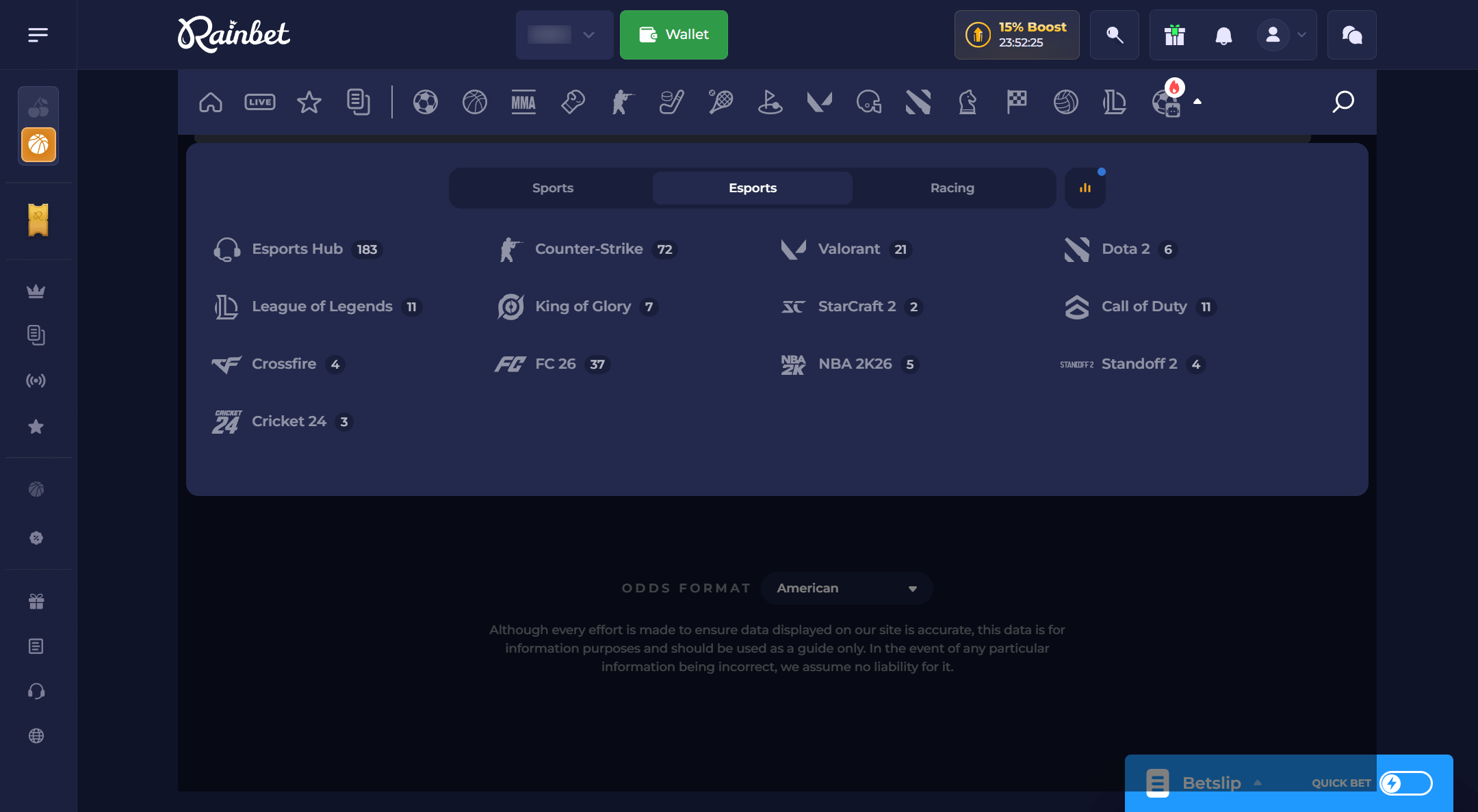 Markets go beyond simple match winner: you’ll usually find maps, totals, handicaps, and special options on bigger events. It’s not the deepest specialist esports book on the planet, but for a hybrid casino‑sports site, Rainbet’s coverage is enough to keep a dedicated esports bettor entertained without feeling short‑changed.
