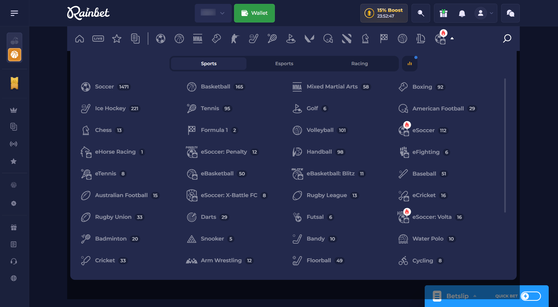 Compared to the average offshore book, Rainbet’s sports list is more than solid. You’re not going to run out of things to bet on unless you’re chasing truly obscure markets.
