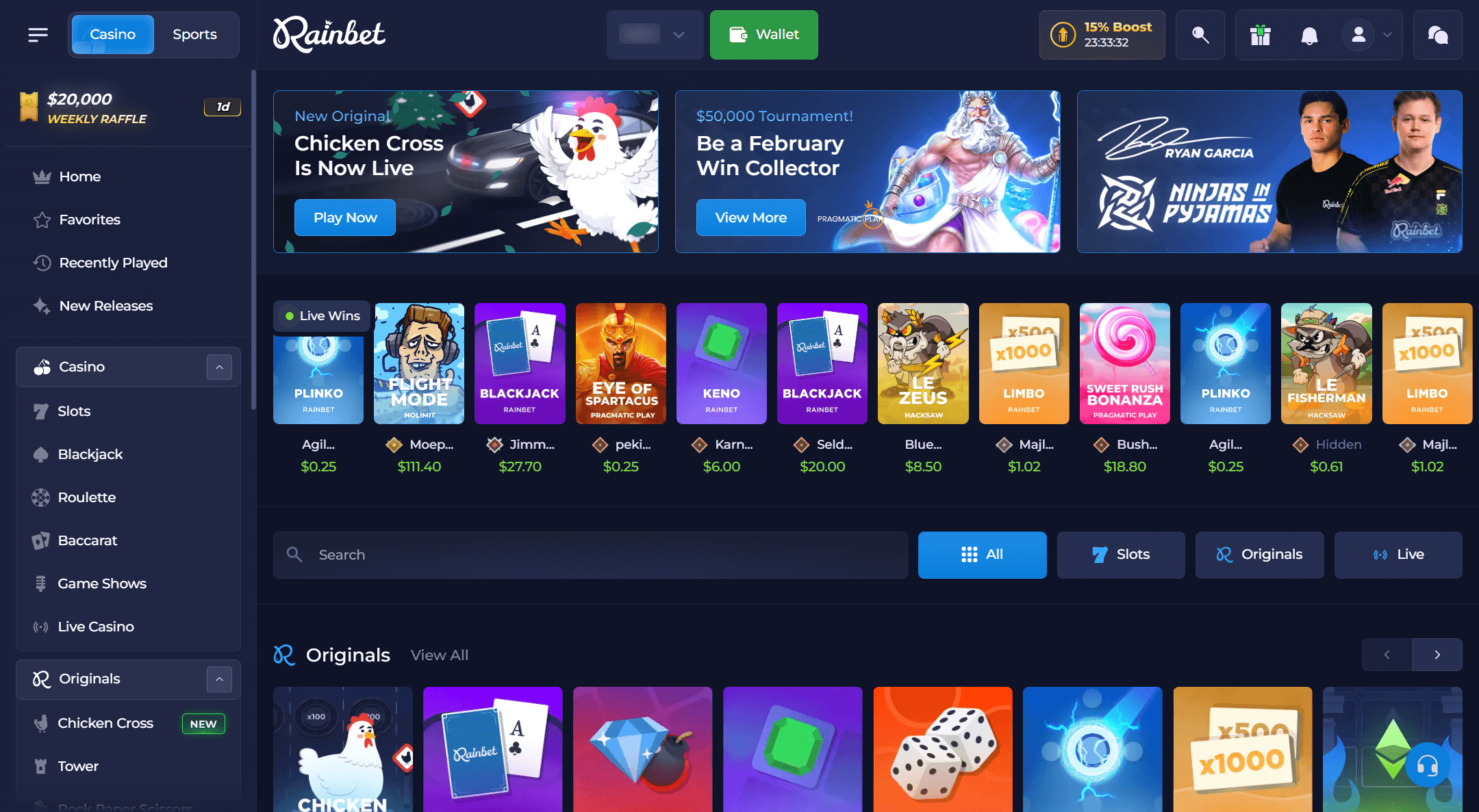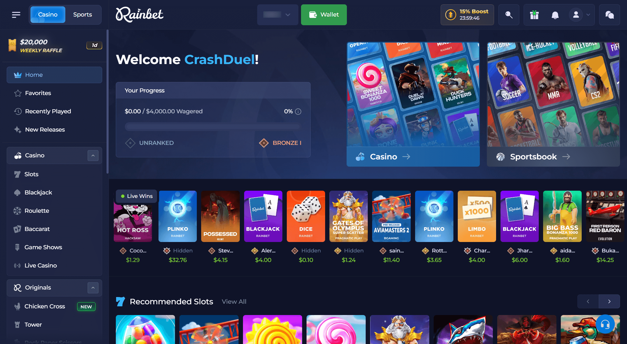 First impression when I landed on Rainbet: modern crypto casino vibes without going full circus. You’ve got the standard layout formula, navigation across the top or side for Sports, Casino, Live Casino, In‑House, Promotions, VIP, and then big, colorful tiles pulling you into slots and featured events.