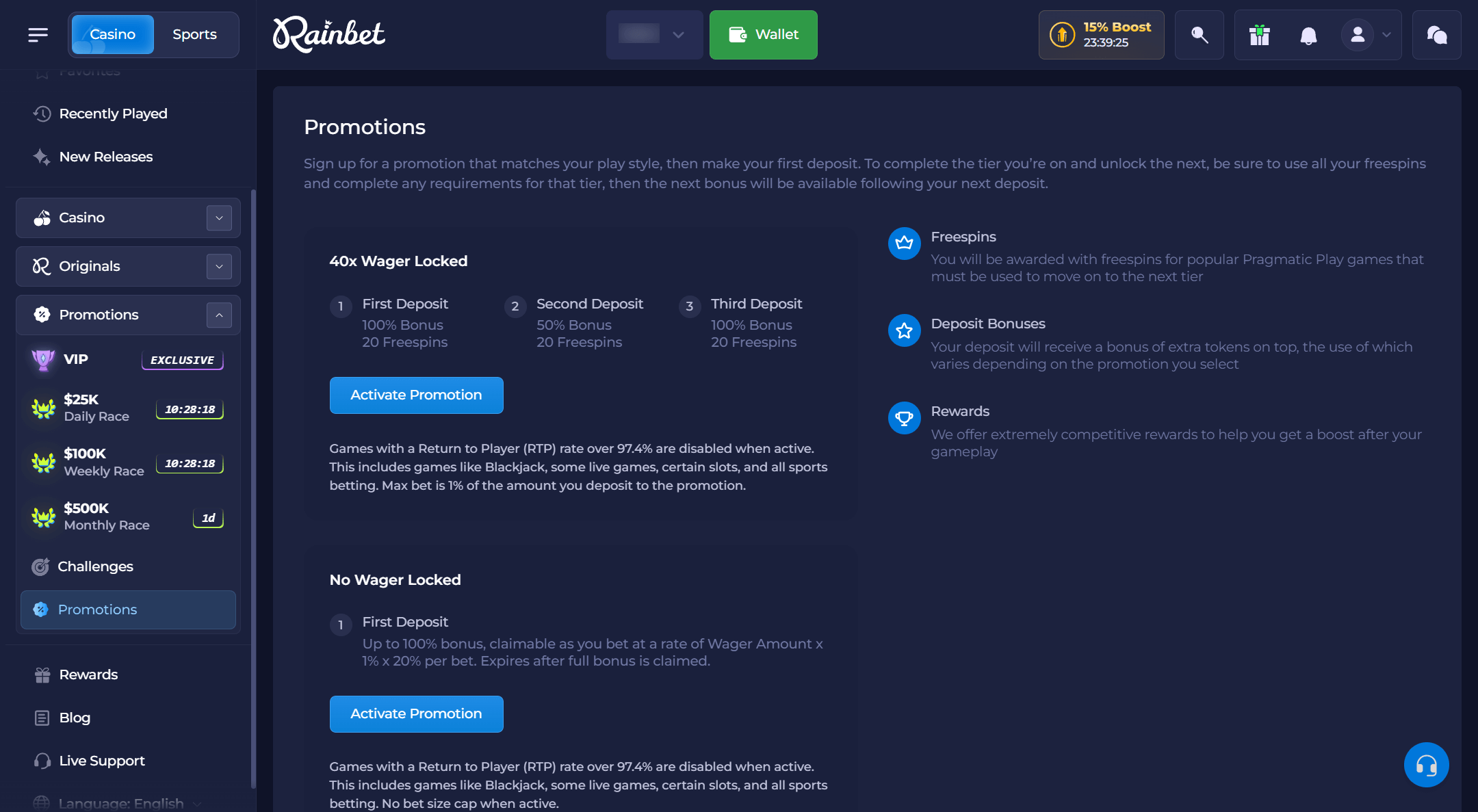 On the casino bonus front, Rainbet doesn’t falter; if anything, it leans heavily into continuous value for slot grinders and table game fans. You’ll see a mix of deposit bonuses, free spins, and loyalty‑driven rewards that keep the reels spinning even after you’ve burnt through the welcome offer.