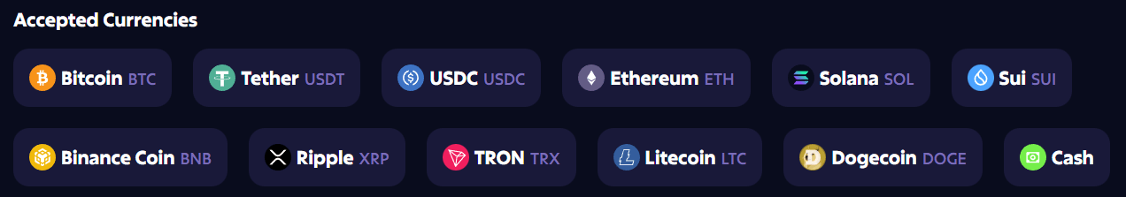 - Commonly supported: Bitcoin, Ethereum, Tether, and other major coins, with occasional additions based on demand.