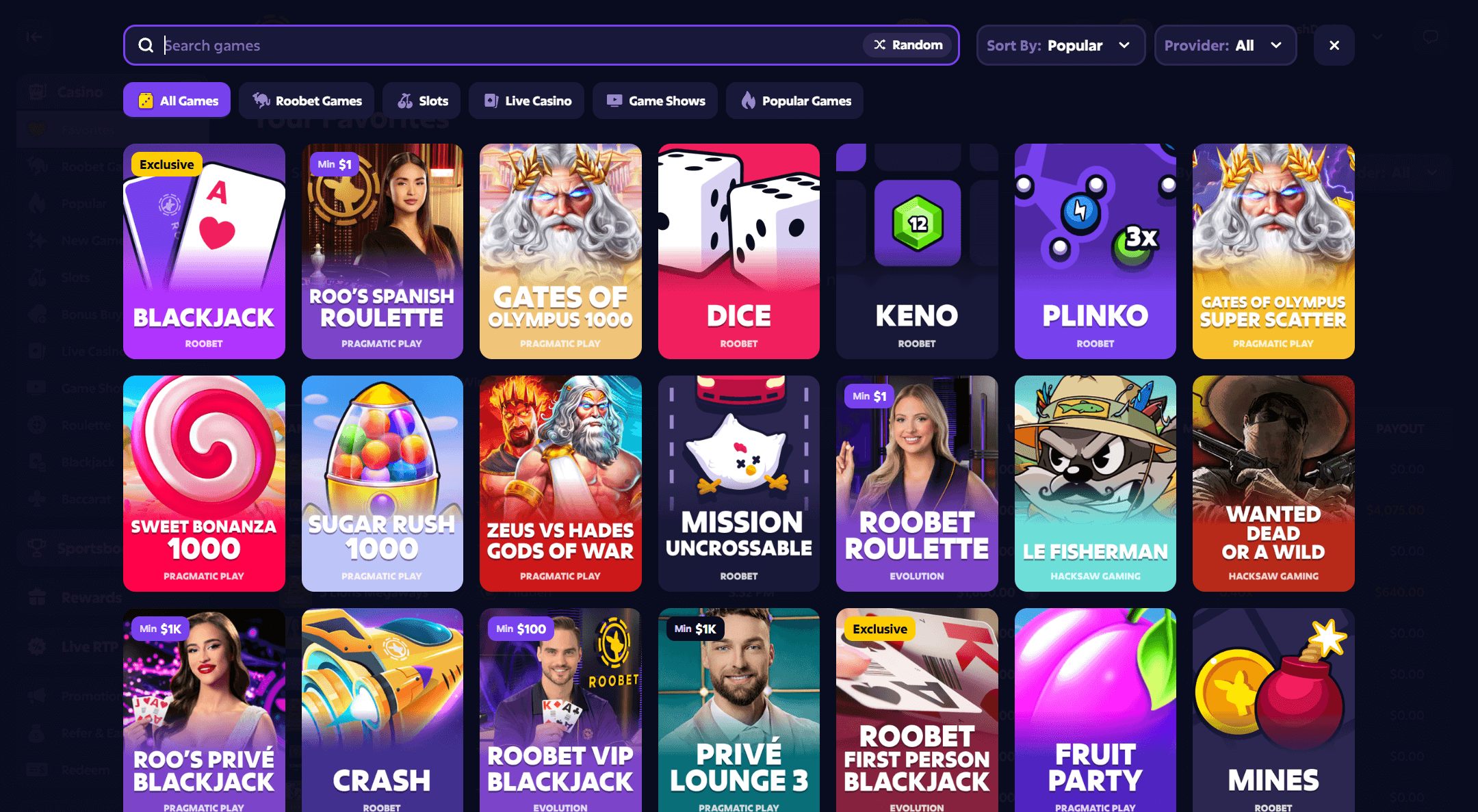 Roobet offers a large, multi‑thousand‑title casino library, split across regular RNG games and a hefty live casino section.