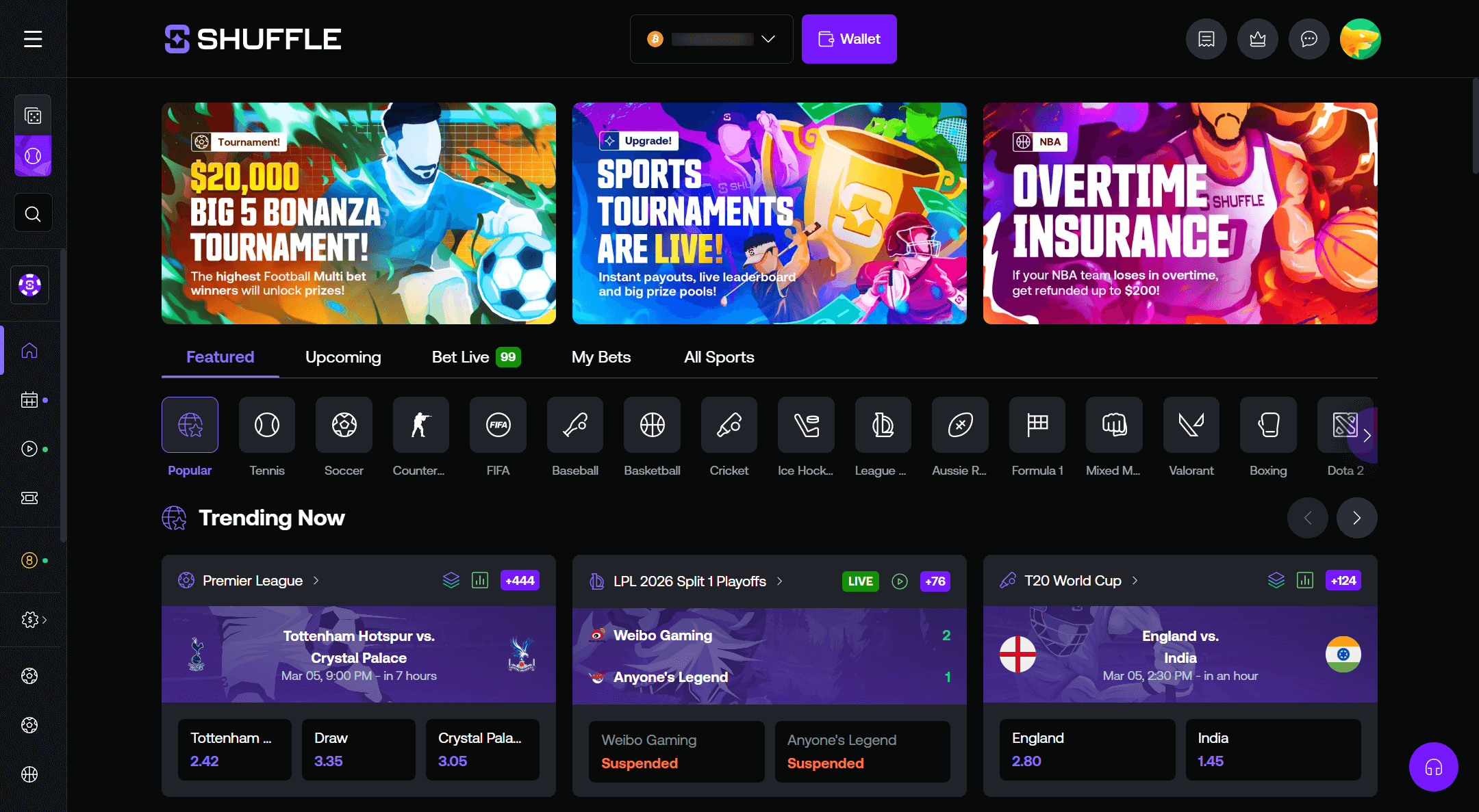 Shuffle isn’t pretending to be the world’s biggest traditional sportsbook, but it covers the core ground well enough that most bettors will feel at home. You get a familiar spread of popular sports and leagues, with enough depth to keep weekends and big tournament days busy.