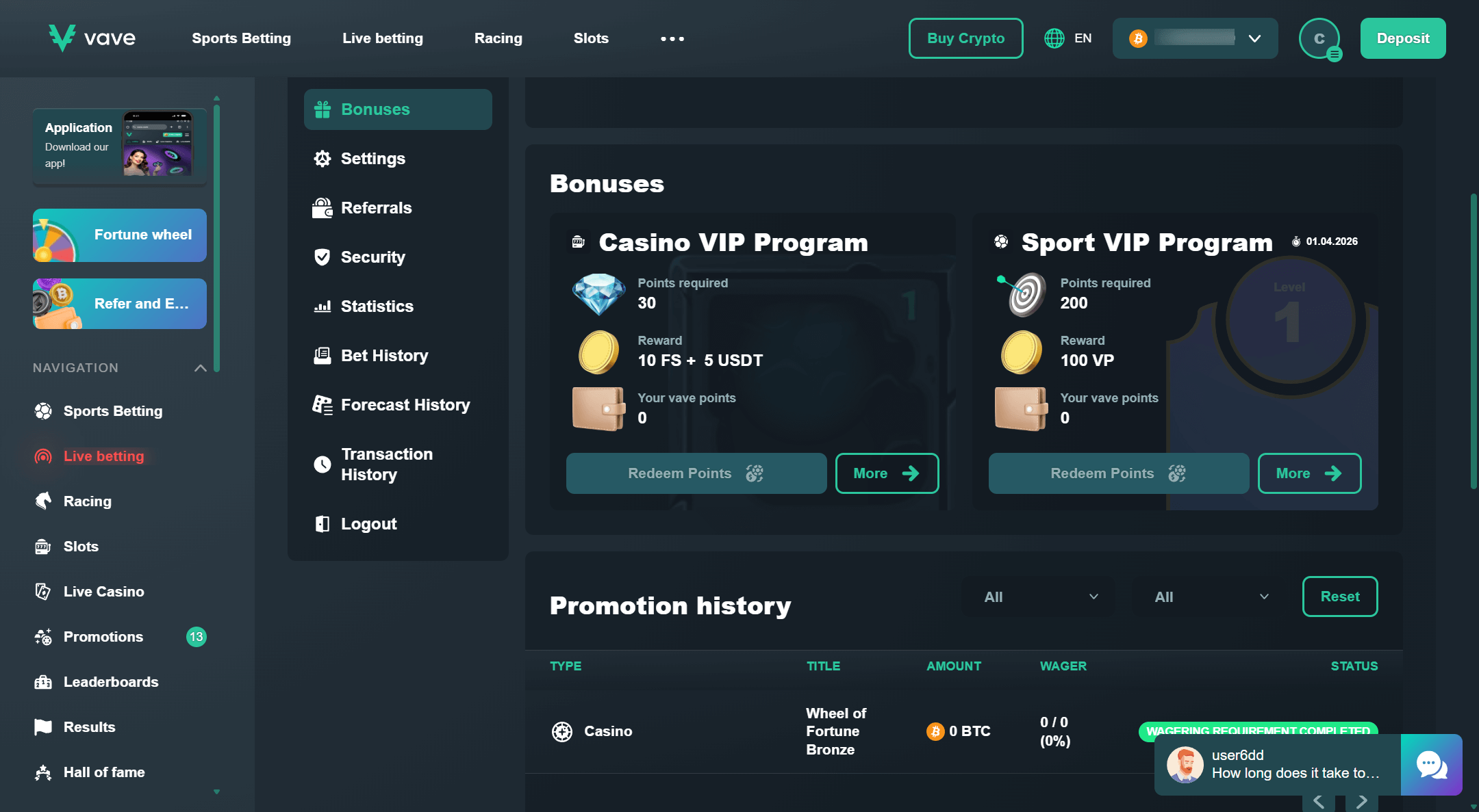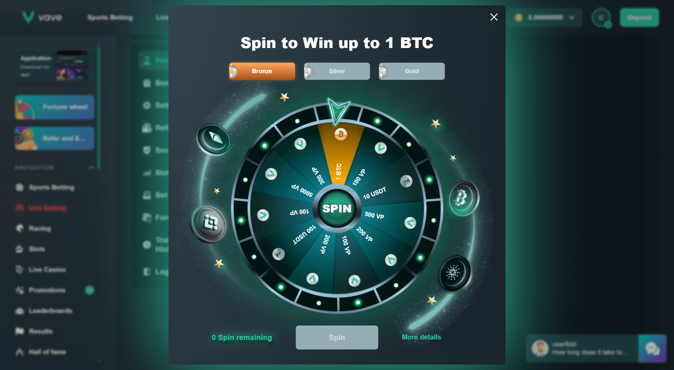 Vave also runs slot tournaments and occasional free-spin promotions tied to specific games or providers.
